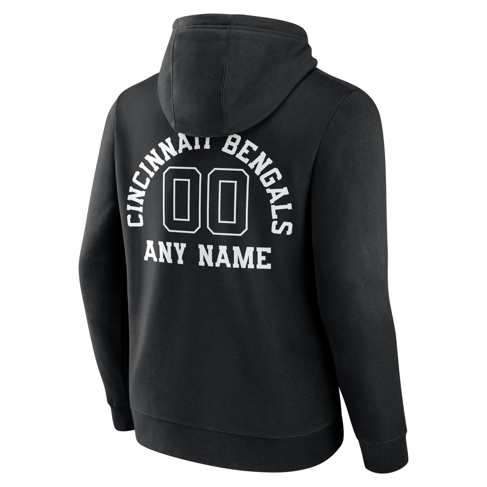 We want fans to celebrate their fandom by customizing and personalizing certain products. For these customizable products, including jerseys, we invite customers to tell us how they would like their preferred name or other text to appear by typing that text into the field indicated. However, just because a customer is able to type proposed customization text into the field and is able to complete the order through the website, not all proposed customization text will be accepted. Please note, Fanatics may reject and cancel any customization order for any reason, including for messages that are deemed offensive or inappropriate. Show your Cincinnati Bengals pride all season long with this Personalized Name & Number Pullover Hoodie. This classic hoodie is crafted from soft, cozy fabric for all-day comfort. The bold graphics are the perfect way to demonstrate your Cincinnati Bengals fandom, whether you’re at the game or just running errands around town.