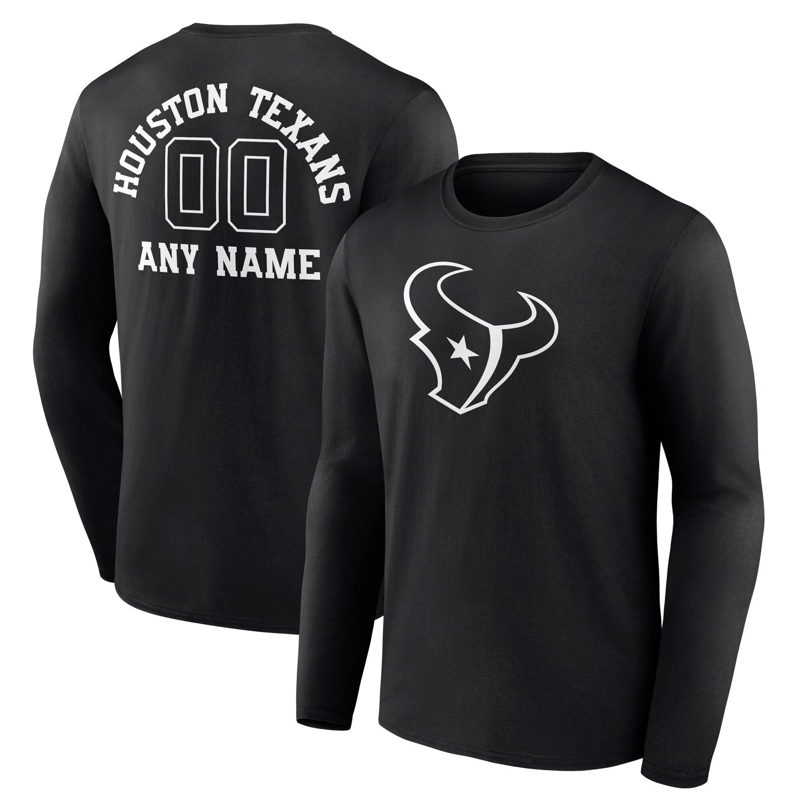We want fans to celebrate their fandom by customizing and personalizing certain products. For these customizable products, including jerseys, we invite customers to tell us how they would like their preferred name or other text to appear by typing that text into the field indicated. However, just because a customer is able to type proposed customization text into the field and is able to complete the order through the website, not all proposed customization text will be accepted. Please note, Fanatics may reject and cancel any customization order for any reason, including for messages that are deemed offensive or inappropriate. Show your Houston Texans pride all season long with this Personalized Name & Number Monochrome Long Sleeve T-Shirt. This cozy tee is crafted from soft, breathable fabric for all-day comfort. The bold graphics are the perfect way to demonstrate your Houston Texans fandom, whether you’re at the game or just running errands around town.