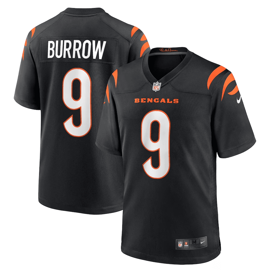 DescriptionRep the on-field look of your favorite Cincinnati Bengals player with this Joe Burrow Game jersey from Nike. Its heat-sealed name, numbers and team details provide a kickoff-ready aesthetic while also offering a comfortable, lightweight feel. Designed for everyday movement, this jersey has a versatile tailored fit and features mesh side panels for added ventilation as you celebrate every big play by the Cincinnati Bengals this season.