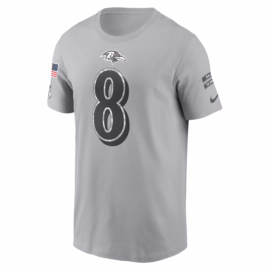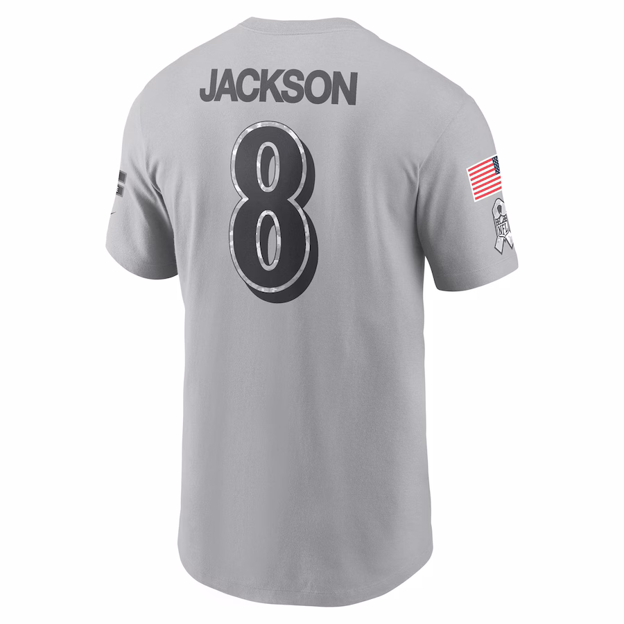 Lamar Jackson Baltimore Ravens Nike 2024 Salute To Service Name & Number T-Shirt – Gray