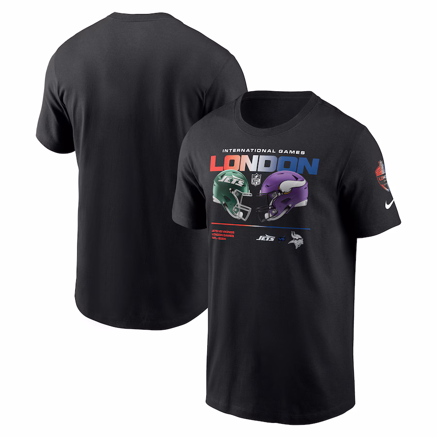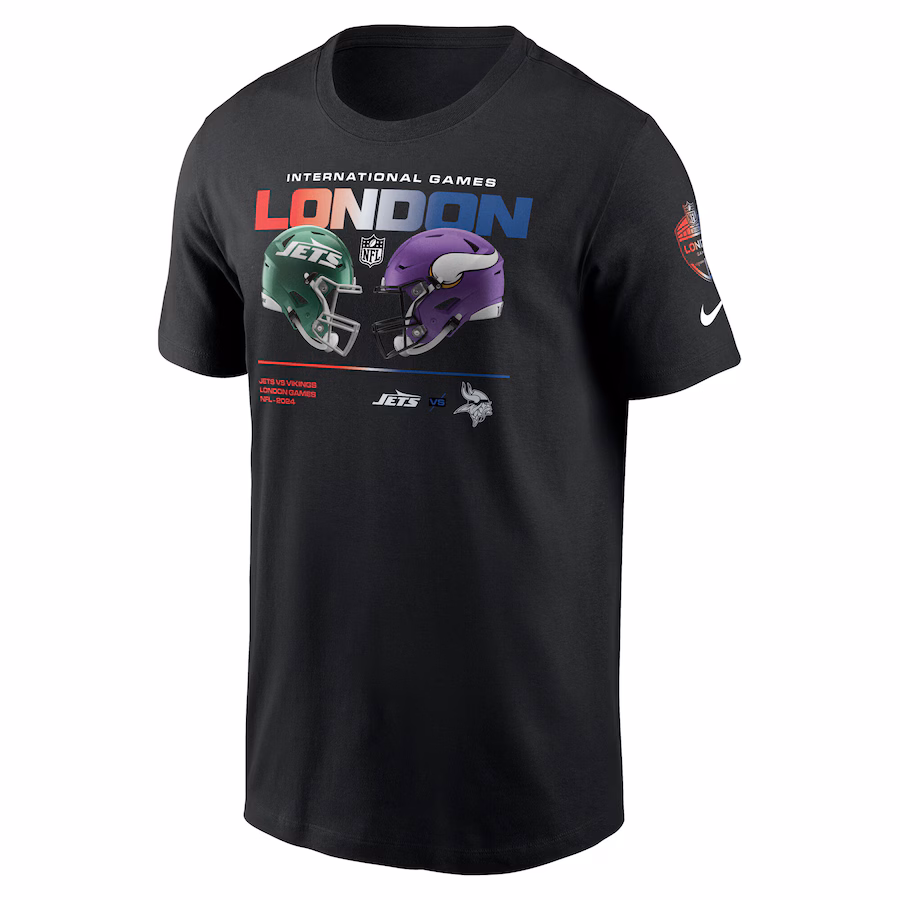New York Jets vs. Minnesota Vikings Nike International Games London 2024 T-Shirt – Black