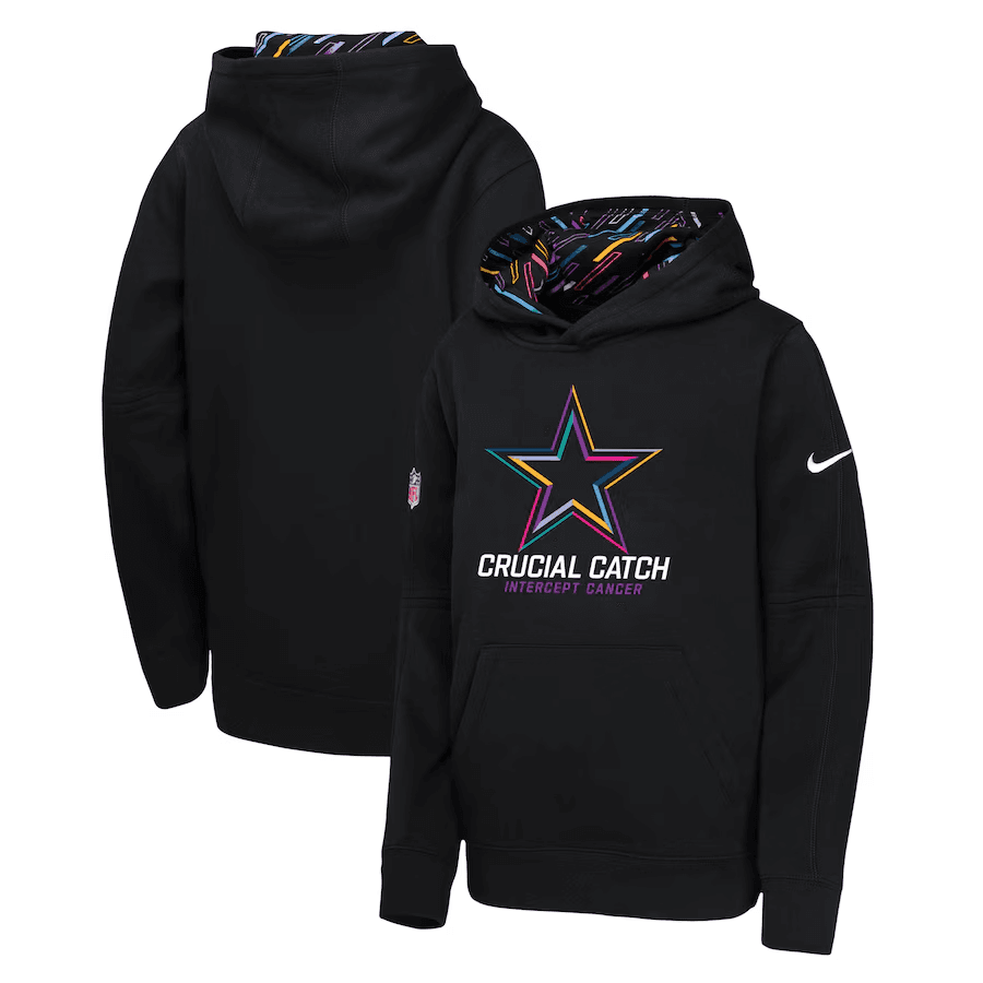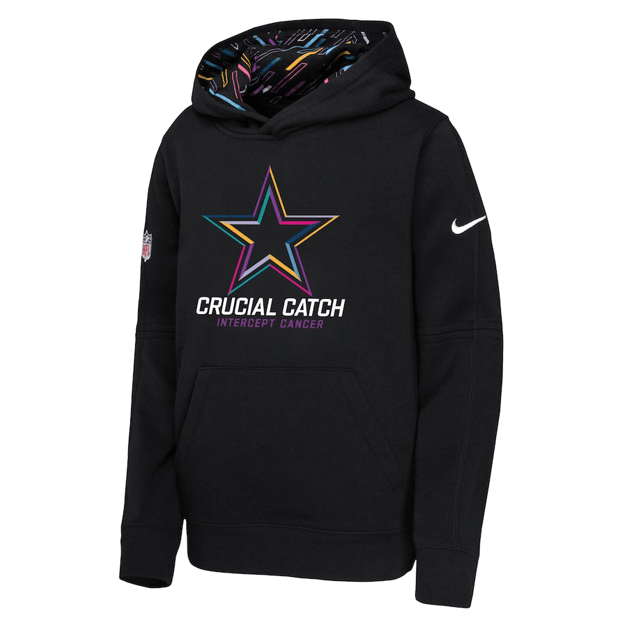 Intercept cancer with the 2024 NFL Crucial Catch Collection from Nike. In the spirit of the various cancer ribbon colors, this Club Pullover Hoodie features your Dallas Cowboys logo on the front over a multi-color patch. Join the Dallas Cowboys players as they wear this gear on the sideline during the month of October! The NFL does not profit from the sale of Crucial Catch products. Charitable contributions are awarded by the NFL Foundation to the American Cancer Society.